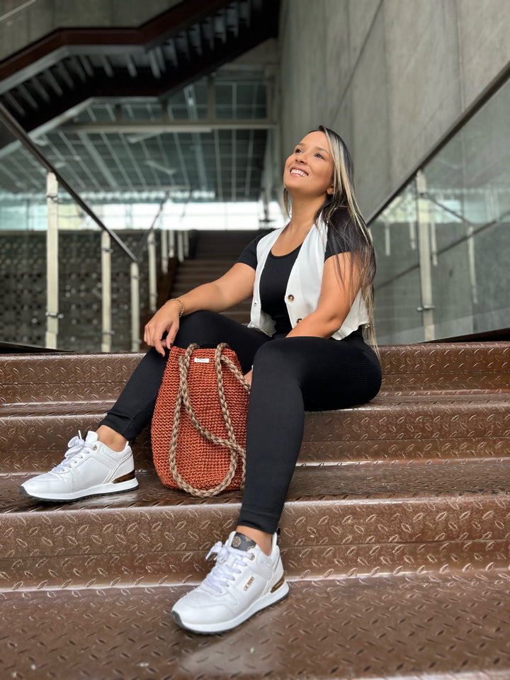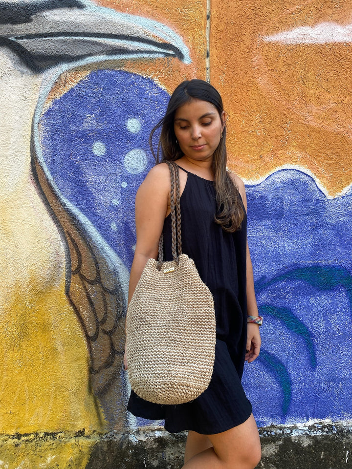 - Asas trenzadas en tonos naturales: Sus asas gruesas, elaboradas en un tono beige natural, aportan comodidad al llevarla, al mismo tiempo que contrastan armónicamente con el cuerpo del bolso, resaltando un equilibrio entre lo rústico y lo sofisticado.